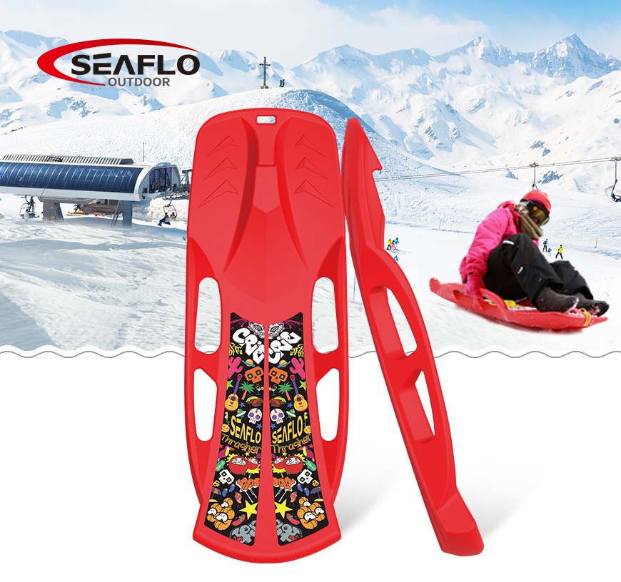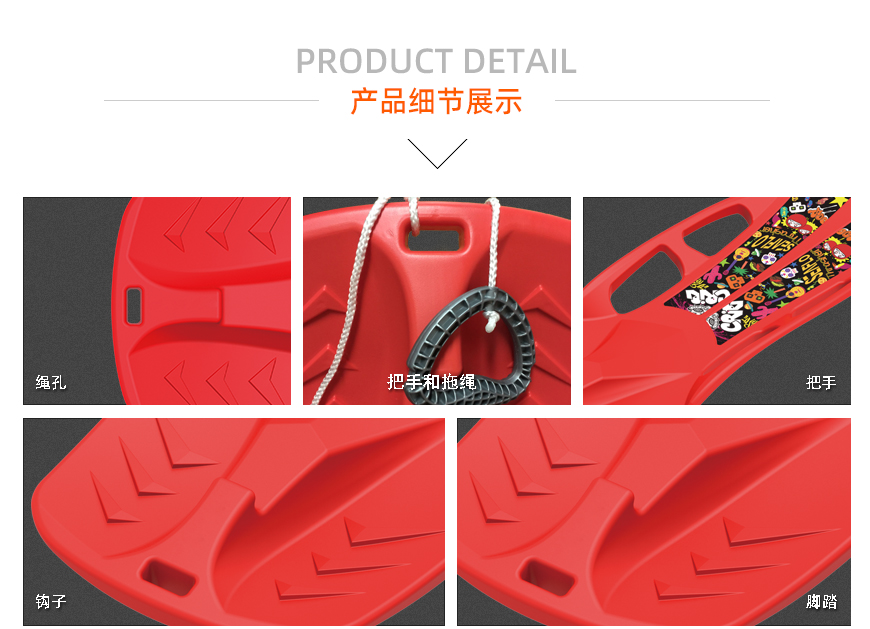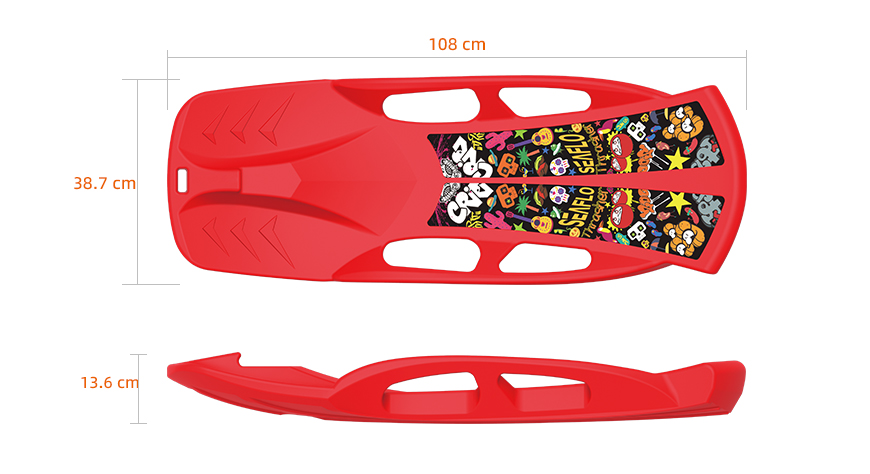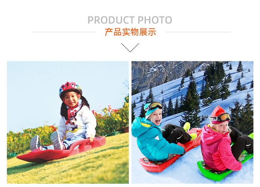 它是一款专为孩子而设计的游戏用雪橇板!坐姿、跪姿、俯卧、两名孩子乘坐…玩法随意。您可以利用板头的挂孔连接牵引绳到雪地车,或由同伴手拉牵引滑行,或利用重力滑下舒缓的雪坡。当然,用它在冰面上玩耍也可以。