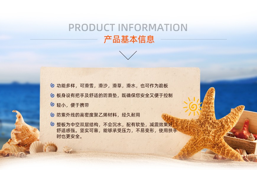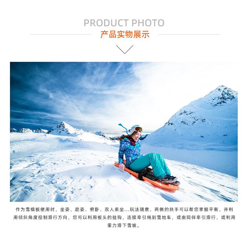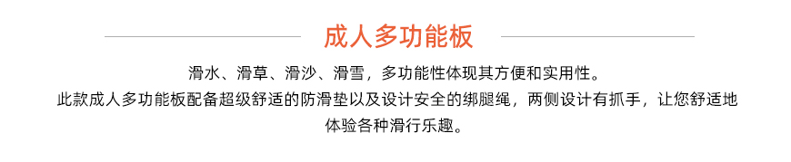 这是一款极具创新的成人多功能板。可以多种方式玩耍,如滑水,滑沙,滑草,滑雪,也可以作为跪板体验超级刺激的滑水运动。超轻的重量和小巧的尺寸设计,可轻轻松松携带至任何地方。