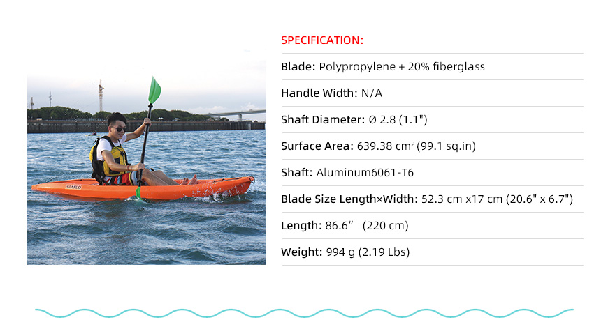 A durable high angle paddle with reinforced fiberglass polypropylene blades and aluminum shaft. Surprisingly lightweight for an aluminum paddle. Good value for paddle! The blades are designed for high angle strokes. This kayak paddle is great for flat water conditions and touring. It features a three-hole button system with 0-degree and 45-degree right or left handed feather positions. The efficient blade design makes the most out of every paddle stroke.