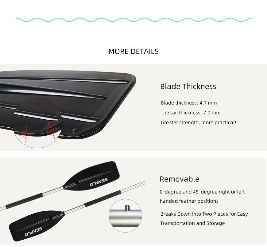 A smaller and lighter blade for low wind resistance and low angle strokes. With its aluminum shaft and fiberglass reinforced polypropylene blades,which gives an even lighter, stronger and stiffer paddle. It has a great blade shape for straight ahead tracking with a palm style grip for a good fit and controlled strokes. Two-piece design allows for easy transportation and convenient storage.